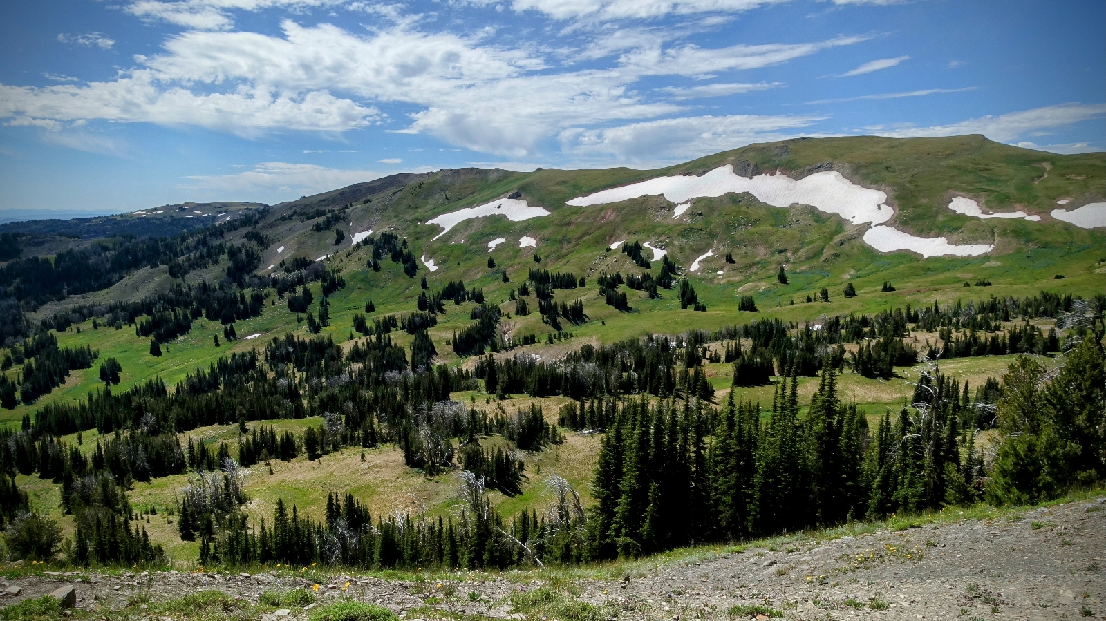 We climbed up to a high pass, coming into Wyoming along the way. At the top, Cory saw a herd of bison grazing on top of a nearby mountain at 10k feet.